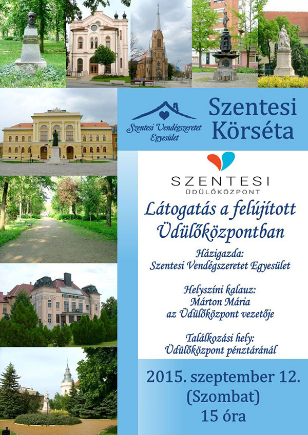 A Szentesi Vendégszeretet Egyesület minden érdeklődőt vár a következő körsétájára, amikor is a megújult Szentesi Üdülőközpontot mutatja be Márton Mária igazgató. Találkozzunk 2015. szeptember 12-én szombaton 15.00 órakor a strand bejáratánál.