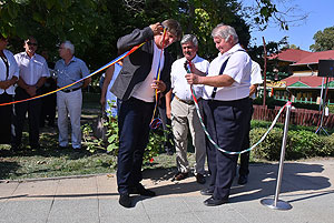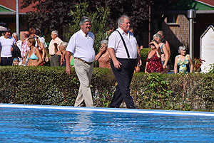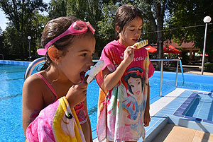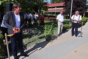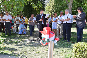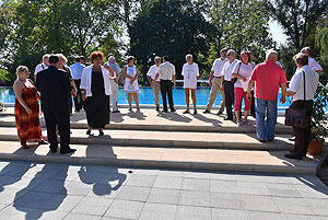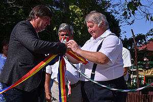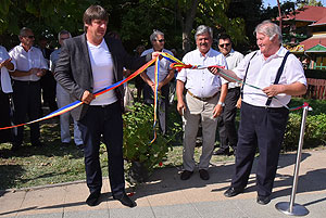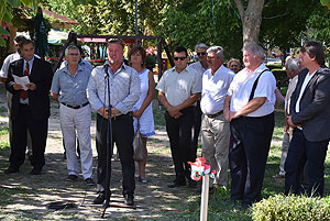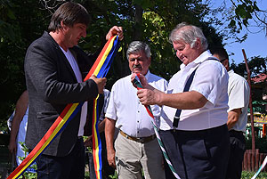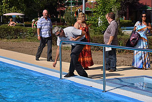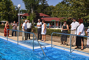A mai nappal teljessé vált a medencekínálat a Szentesi Üdülőközpontban! Ünnepélyes keretek között Szirbik Imre polgármester és a „SportTourism/HURO/1101/172/2.1.3” projekt romániai partnerét adó Újszentes alpolgármestere Miklós Árpád nem átvágta a román és a magyar nemzetiszínű avatószalagot a medence partján, hanem pont ellenkezőleg, összekötötték azt.