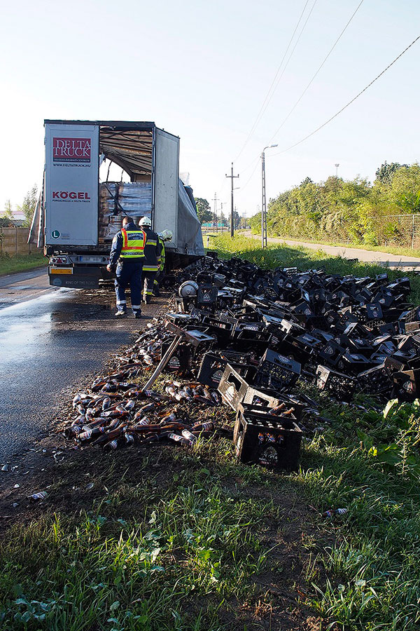 Szétszóródott sörösüvegek és rekeszek Szentes mellett. A szeszes italt szállító kamion sofőrje egy kanyarban feltehetőleg túl nagy sebességgel közlekedett és leborult a több száz rekesz sör nagy része az úttestre és az árokba. A balesetben senki sem sérült meg. Csak a sör :(