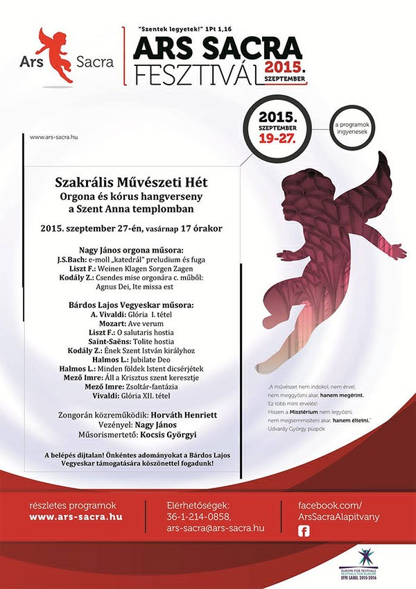 Tisztelettel meghívjuk Önt és kedves családját, barátait a Szakrális Művészeti Hét keretében 2015. szeptember 27-én, vasárnap 17 órakor a Szent Anna templomban megrendezendő Orgona és kórus hangversenyre. A belépés díjtalan, de önkéntes adományokat köszönettel fogadnak.