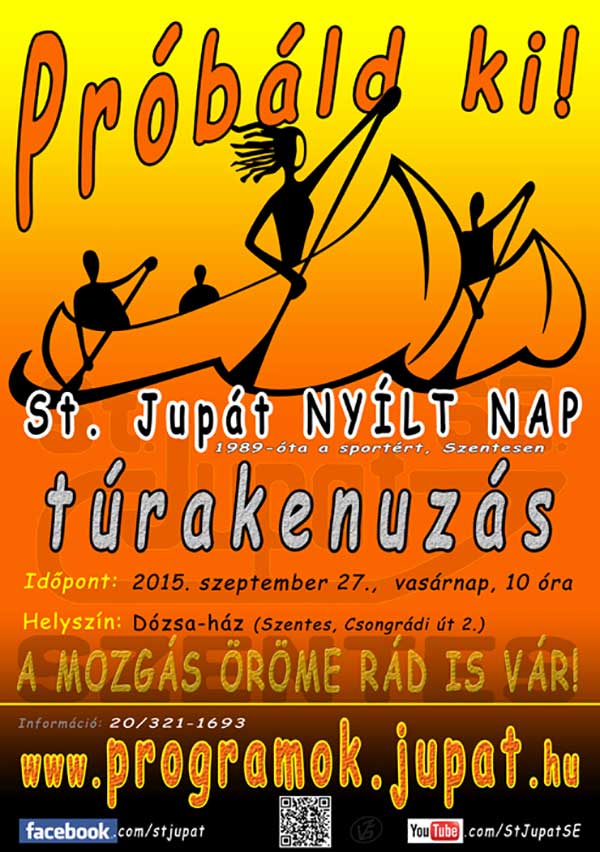A St. Jupát Sportegyesület 2015. szeptember 27-én (vasárnap), 10 órakor NYÍLT NAP lakossági sportrendezvényt tart, ahol bárki kipróbálhatja a túrakenuzást!