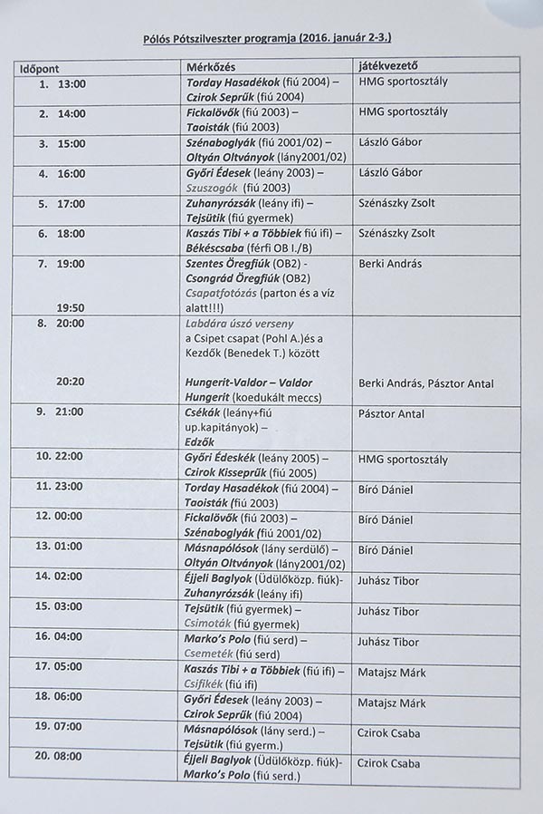 Év végi közös vacsora helyett év eleji pólós pótszilvesztert szervez a Szentesi Vízilabda Klub január 2-3-án a fedett uszodában. A szombat délben kezdődő mérkőzéseken összesen 20 mérkőzést játszik 24 csapat. Bíró Dániel ügyvezető sajtótájékoztatón elmondta, hogy az első mérkőzés január 2-án 13 órakor, az utolsó vasárnap reggel 8 órakor kezdődik.