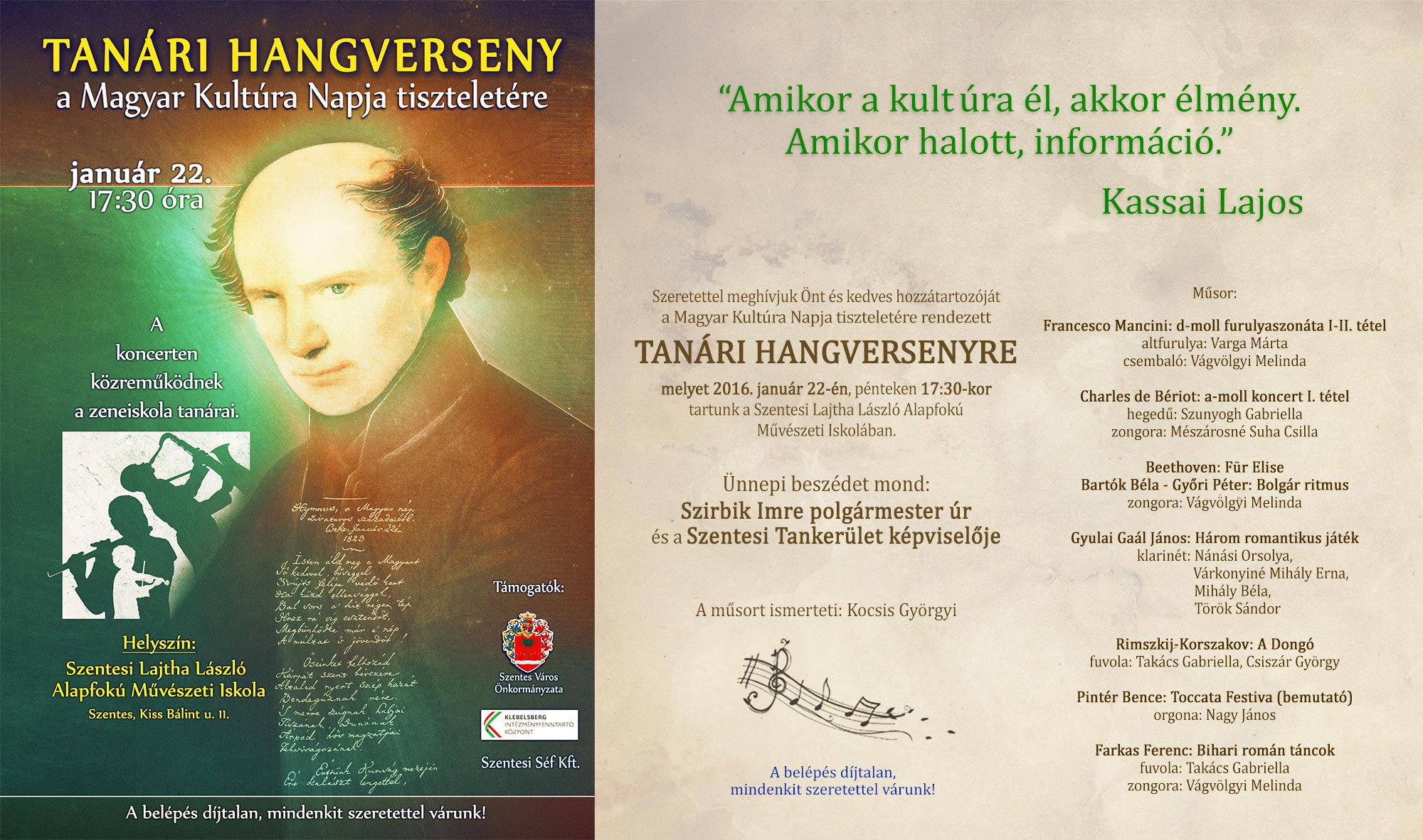 Tanári hangverseny a Magyar Kultúra Napja tiszteletére A Magyar Kultúra Napja tiszteletére 2015. január 22-én tanári hangversenyt rendeznek a Lajtha László Alapfokú Művészeti Iskolában. Évek óta hagyomány Szentesen, hogy a Magyar Kultúra napjáról a Lajtha László Alapfokú Művészeti Iskola a hangversenytermében rendezett ünnepi koncerttel emlékezik meg.