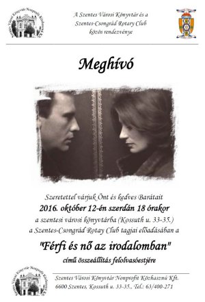 A Szentes Városi Könyvtár és a Szentes-Csongrád Rotary Club szeretettel meghívja Önt és kedves Barátait 2016. október 12-én szerdán 18 órakor a szentesi városi könyvtárba a Szentes-Csongrád Rotary Club tagjainak előadásában a „Férfi és nő az irodalomban” című összeállítás felolvasóestjére. A műsor első részében versek és rövid páros jelenetek lesznek, a második részben pedig Móricz Zsigmond: Kend a pap? című egyfelvonásos komédiája hangzik el.