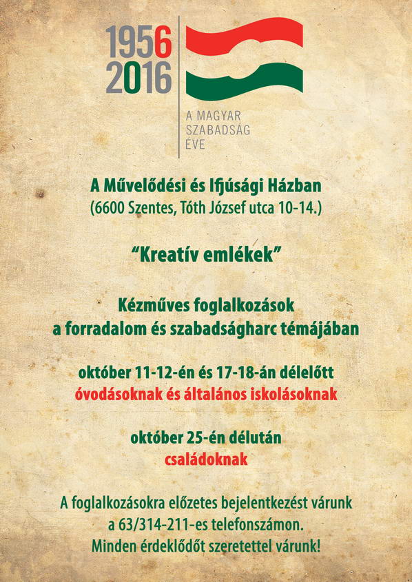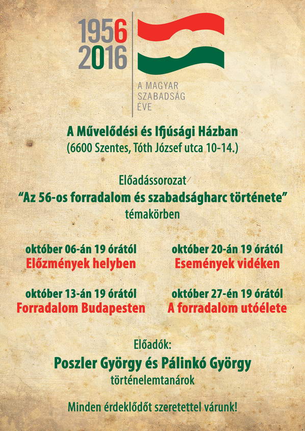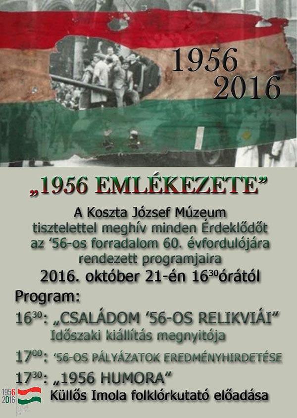 A Koszta József Múzeum tisztelettel meghívni minden érdeklődőt az '56-os forradalom 60. évfordulójára rendezett programjaira. 2016. október 21-én 16 óra 30 perckor kezdődik A családom '56-os relikviák időszaki kiállítás. 17 órától '56-os pályázatok eredményhirdetése várható 17 óra 30 perctől 1956 humora címmel Küllős Imola folklór kutató előadását hallhatjuk a Koszta József Múzeumban.