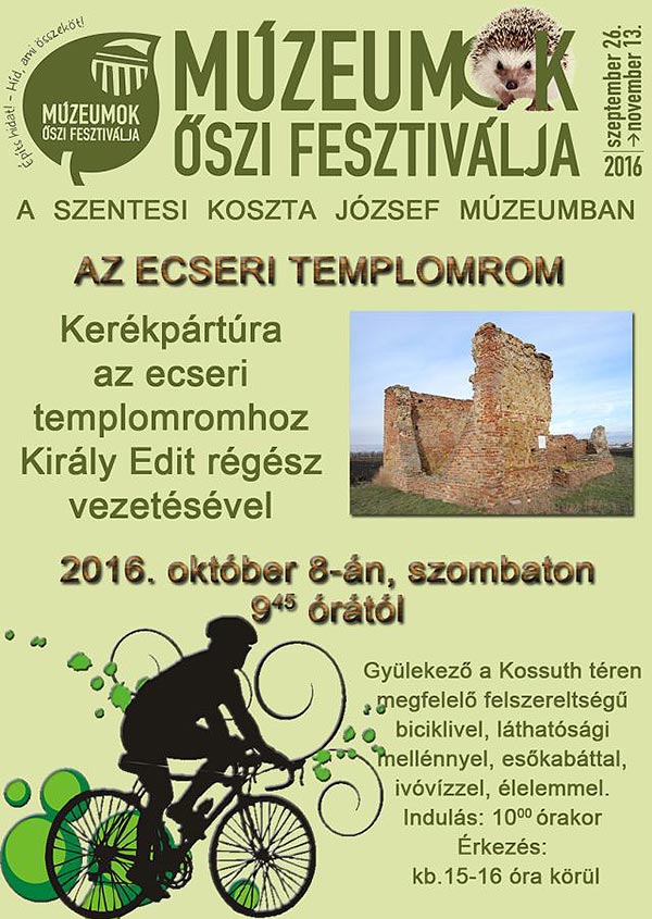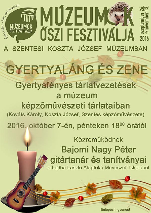Minden érdeklődőt szeretettel várunk a Múzeumok Őszi Fesztiválja jövő heti programjaira: 2016. október 7-én 18 órától Gyertyaláng és gitárzene címmel gyertyafényes tárlatvezetést tartunk a múzeum képzőművészeti kiállításaiban. Közreműködnek Bajomi Nagy Péter zenetanár és tanítványai. 2016. október 8-án 10 órától kerékpártúrát szerveznek Király Edit régész vezetésével az ecseri templomromhoz.