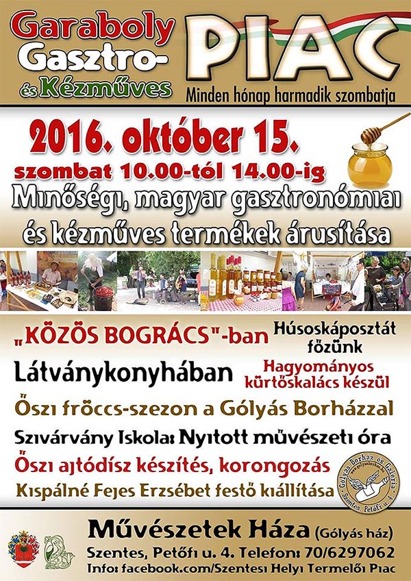 A minden hónap 3. szombatján megrendezésre kerülő szentesi Gasztro Piac nem egyszerűen termelői piac, hanem kulturális platform, az egészséges étkezéshez és fenntartható fejlődéshez ihletforrás, egy életérzés, turisztikai attrakció.. A PIAC legjobb termékeivel, húzott házi rétessel, helyszínen készülő szilvapálinkás desszerttel, minőségi kézműves csokoládékkal, diós kecskesajttal, húsos káposztával várunk mindenkit! Közben kovásszal kenyeret sütünk és lesznek művészeti gyerekfoglalkozások. Mindenkit szeretettel várunk!