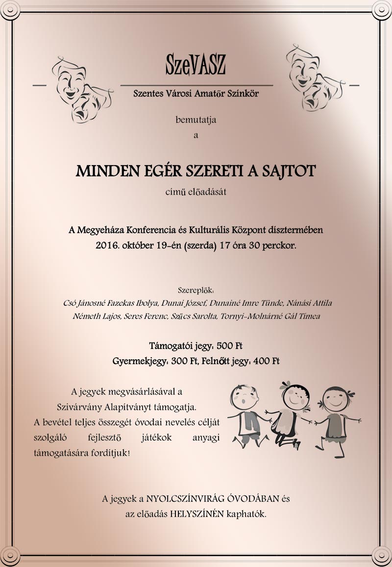 SzeVASZ Szentes Városi Amatőr Színkör bemutatja a MINDEN EGÉR SZERETI A SAJTOT című előadását a Megyeháza Konferencia és Kulturális Központ dísztermében 2016. október 19-én (szerda) 17 óra 30 perckor.