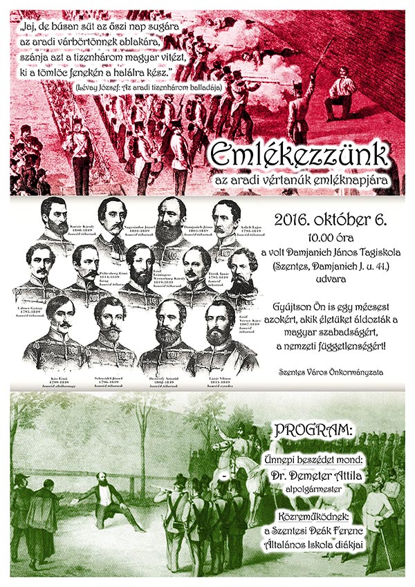Szentes Város Önkormányzata 2016. október 6-án 10:00 órai kezdettel tart megemlékezést a volt Damjanich János Tagiskola épületénél az ARADI VÉRTANÚK tiszteletére.