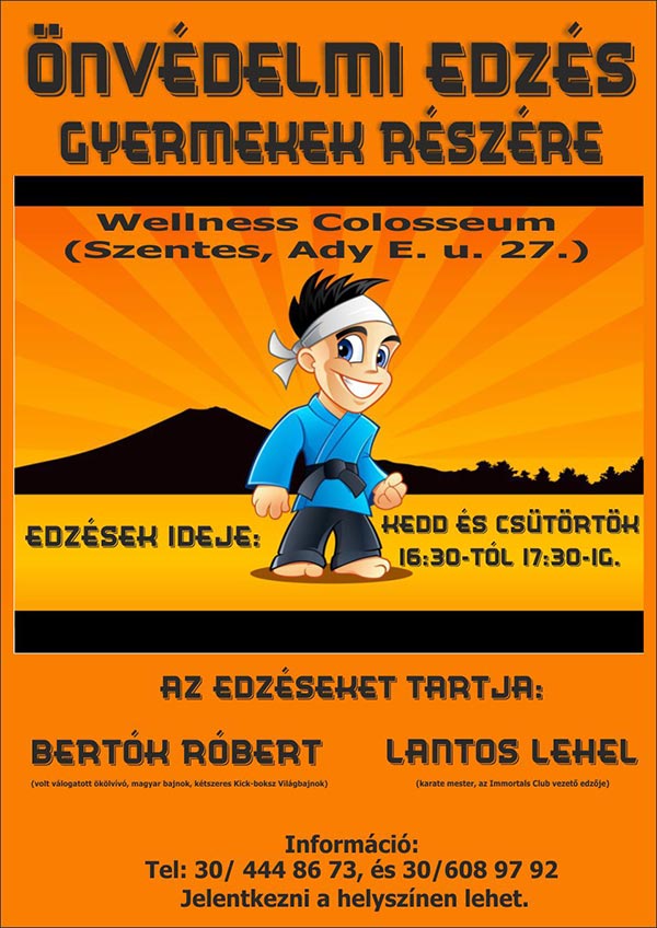 Minden kedden és csütörtökön gyermek önvédelmi edzés indul a Wellness Colosseumban, ahol Bertók Róbert és Lantos Lehel várja a jelentkezőket. További részletek a plakáton és az alábbi telefonokon.