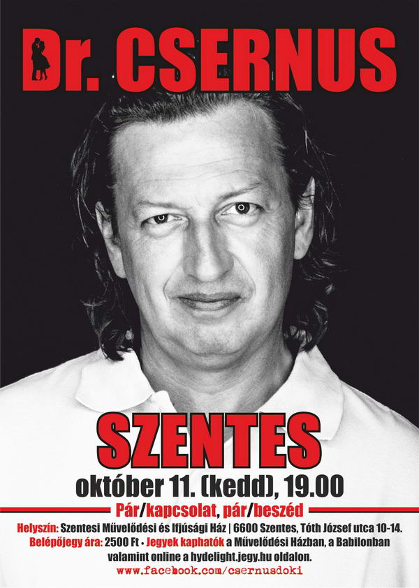 A párkapcsolatokról és a párkapcsolati kommunikációról tart interaktív előadást október 11-én Szentesen az ország legismertebb pszichiátere. Dr. Csernus Imre szókimondó műsorával robbant be évekkel ezelőtt a köztudatba, manapság előadásokat és önismereti tréningeket tart, borászkodik, saját pékséget és kávézót üzemeltet.