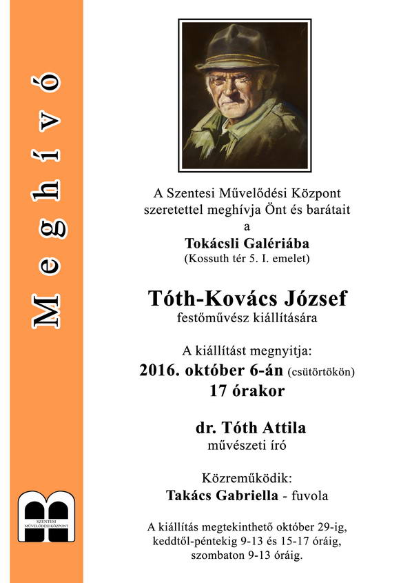 Szentesi Művelődési Központ Tokácsli Galériájában Tóth-Kovács József festőművész kiállítása nyílt meg 2016. október 6-án. A kiállítást dr. Tóth Attila művészeti író nyitotta meg.