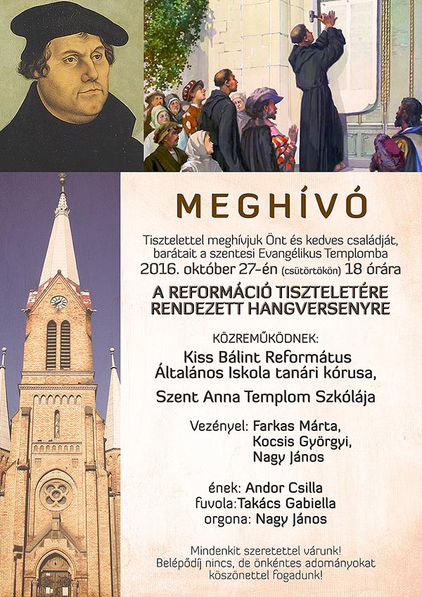 Tisztelettel meghívjuk Önt és kedves családját, barátait a szentesi Evangélikus Templomba 2016. október 27-én (csütörtökön) 18 órára A REFORMÁCIÓ TISZTELETÉRE RENDEZETT HANGVERSENYRE.