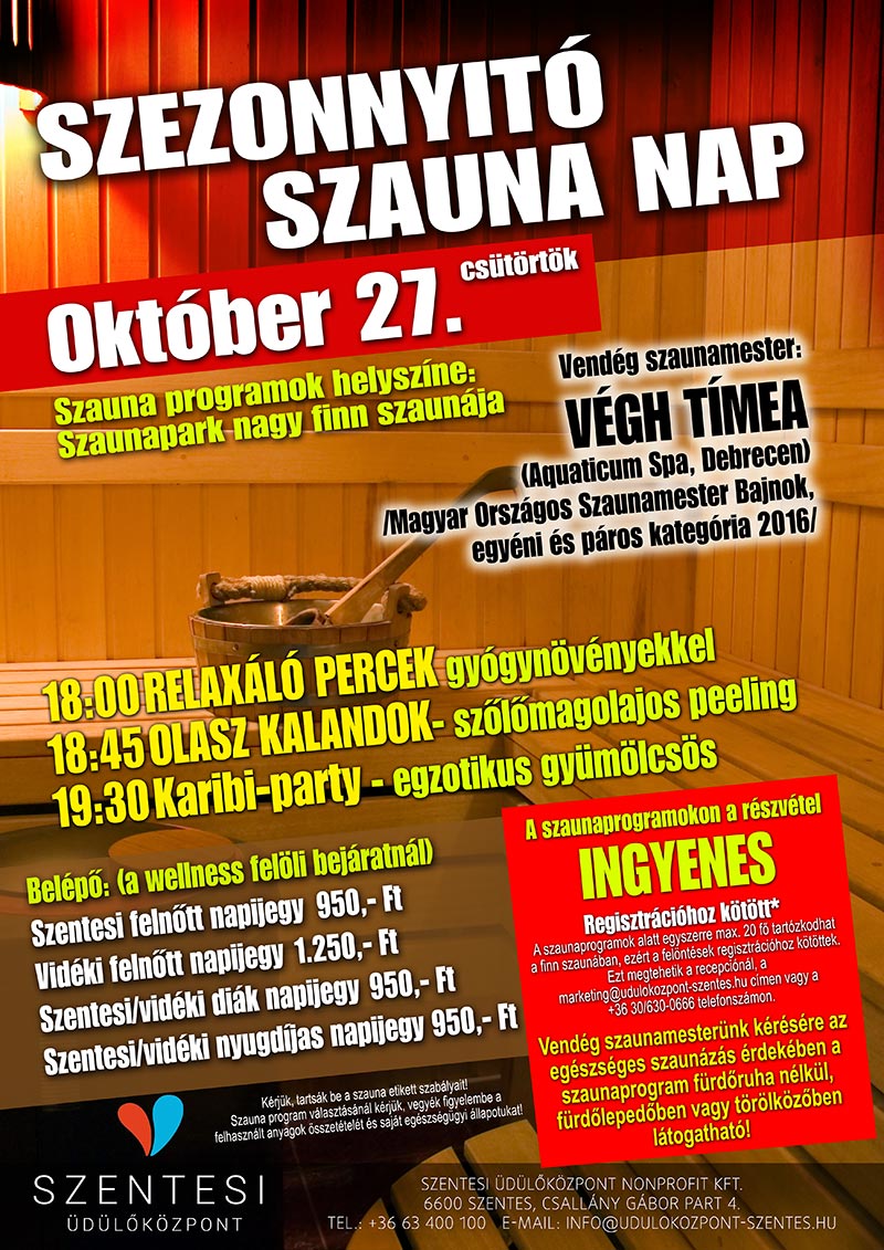 Ezen a napon 18:00 órától Relaxáló percek gyógynövényekkel, 18:45-től Olasz kalandok - szőlőmagolajos peeling, valamint 19:30-tól Karibi-party - egzotikus gyümölcsös bőrápolás szauna szeánszon frissíthetjük testünket, lelkünket. Szauna programok helyszíne: Szaunapark nagy finn szaunája Belépő: (a wellness felöli bejáratnál) Szentesi felnőtt napijegy 950,- Ft, Vidéki felnőtt napijegy 1.250,- Ft, Szentesi/vidéki diák napijegy 950,- Ft, Szentesi/vidéki nyugdíjas napijegy 950,- Ft