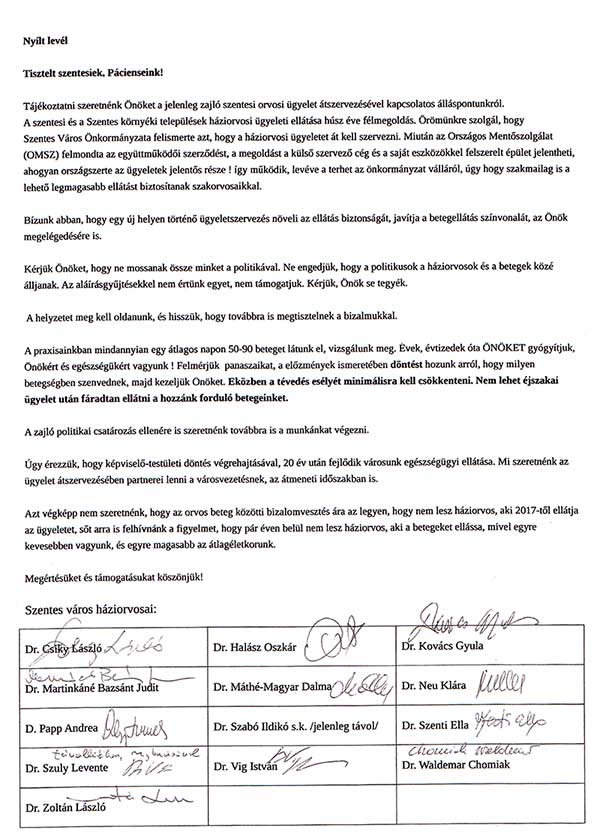 Tisztelt szentesiek. Pácienseink! Tájékoztatni szeretnénk Önöket a jelenleg zajló szentesi orvosi ügyelet átszervezésével kapcsolatos álláspontunkról. A szentesi és a Szentes környéki települések háziorvosi ügyeleti ellátása húsz éve félmegoldás. Örömünkre szolgál, hogy Szentes Város Önkormányzata felismerte azt, hogy a háziorvosi ügyeletet át kell szervezni. Miután az Országos Mentőszolgálat (OMSZ) felmondta az együttműködői szerződést, a megoldást a külső szervező cég és a saját eszközökkel felszerelt épület jelentheti, ahogyan országszerte az ügyeletek jelentős része(!) így működik, levéve a terhet az önkormányzat válláról, úgy hogy szakmailag is a lehető legmagasabb ellátást biztosítanak szakorvosaikkal.