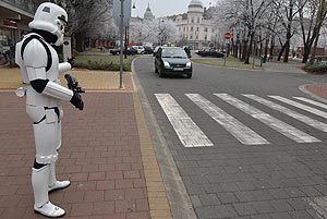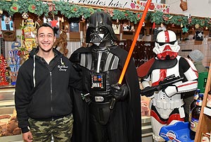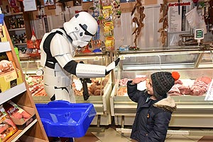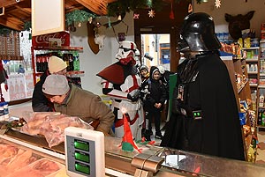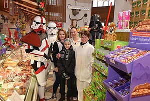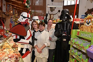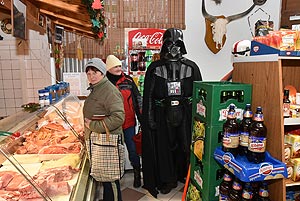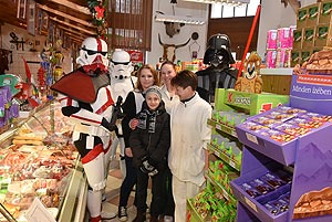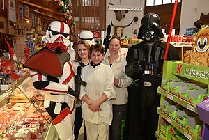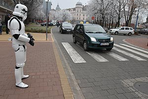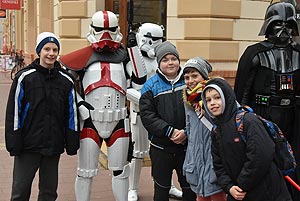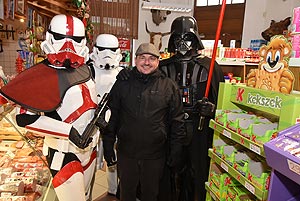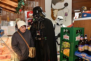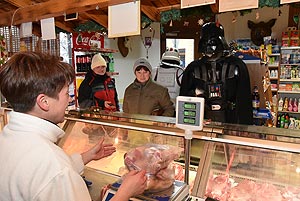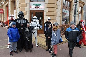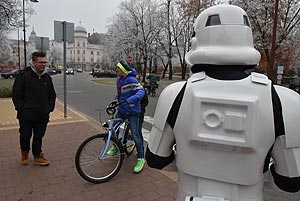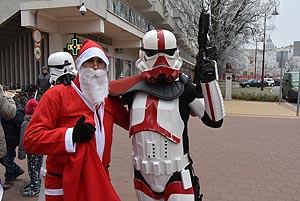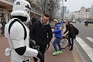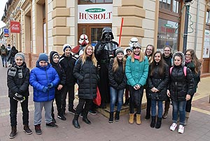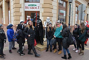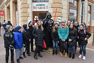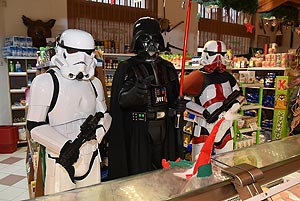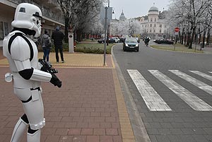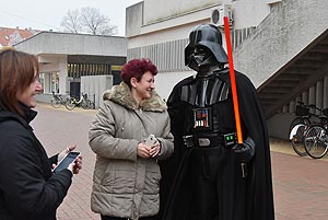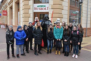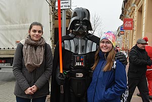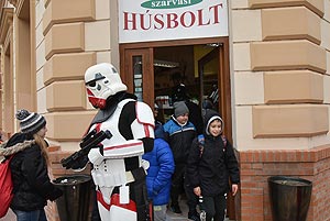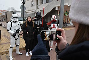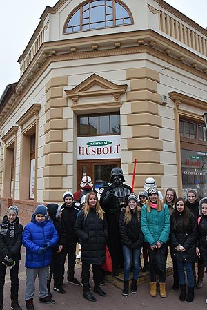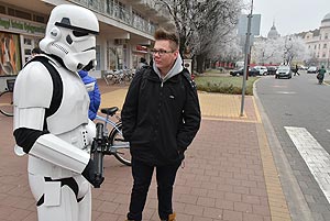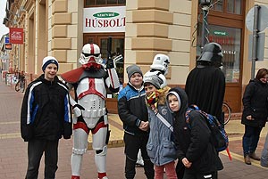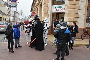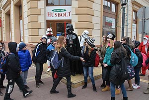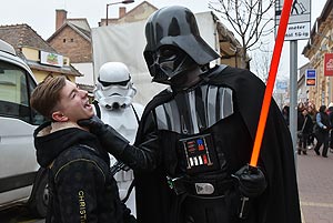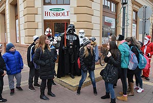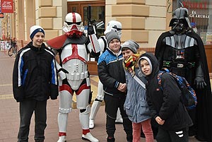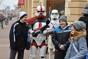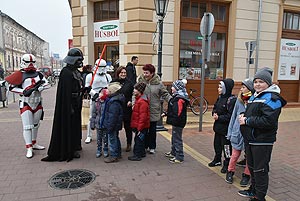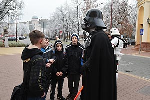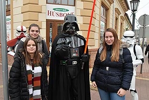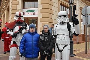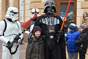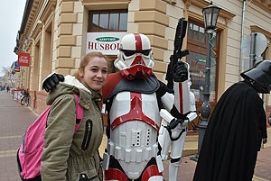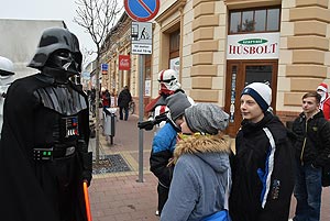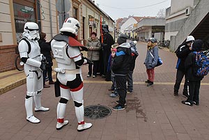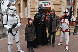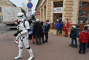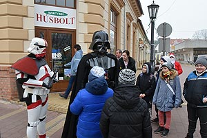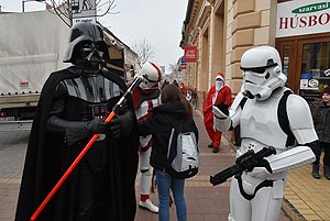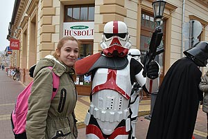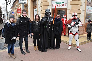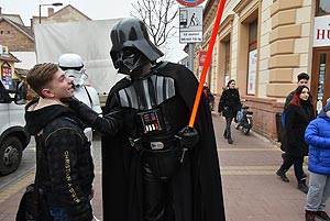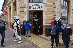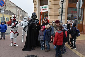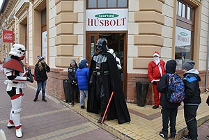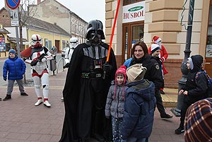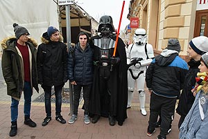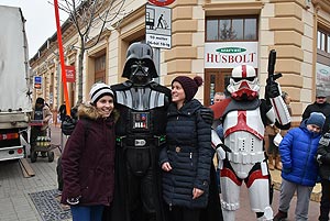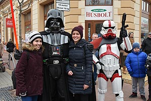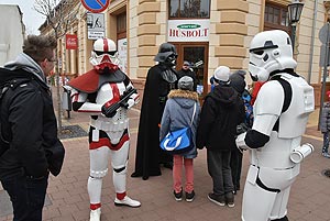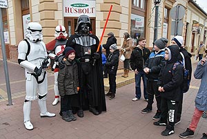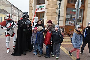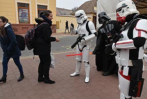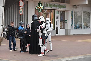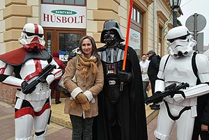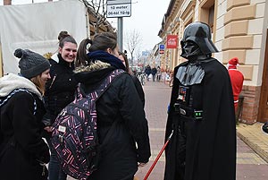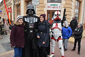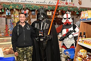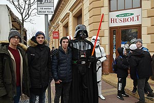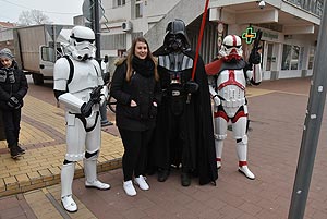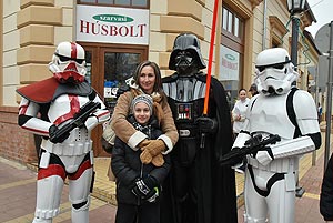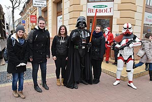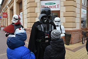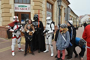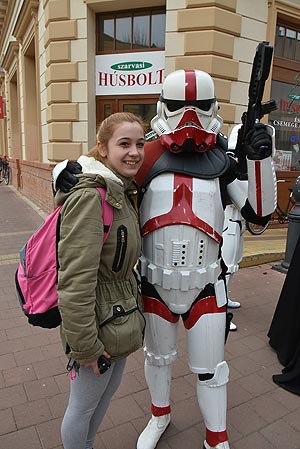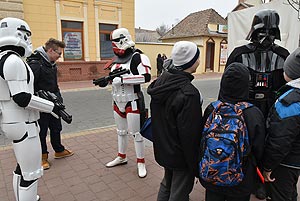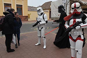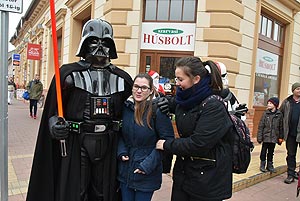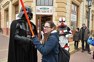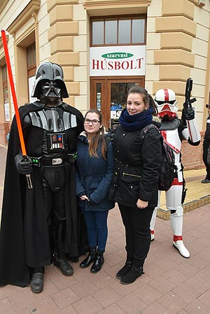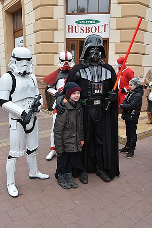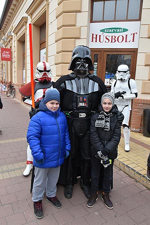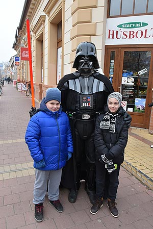 Darth Vader (Anakin Skywalker) a központi figurája George Lucas kitalált Csillagok háborúja univerzumának. Vader az egyik legmarkánsabb, legikonikusabb és legkarizmatikusabb gonosztevő a filmtörténelemben, hatalmas (bár még emberléptékű) termetével, sötét sisakjával, félelmetes akusztikájú, jellegzetes lélegzetvételével és hangképzésével. Szentesen is hallhattuk a hangos levegővételét, valamint mindenkihez volt egy-egy sötét gondolata. A találkozó során készült itt valamint a Szentesi Mozaik facebook oldalán is megtekintheti!