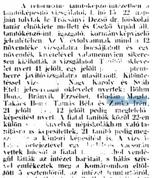 "A Református Tanítóképző Intézetben a tanítóképesítő vizsgálatok folyó hó 15. és 22. napjain folytak le Trócsányi Dezső dr főiskolai tanár elnöklete mellett és Csekő Árpád állami tanítóképző-intézeti igazgató, kormányképviselő jelenlétében. Az V. évfolyamnak mind a 42 növendéke vizsgára bocsáttatott, és egy növendék kivételével valamennyien sikeresen kiállották a vizsgálatot... Jelesrendű oklevelet nyertek: Böhm Ilona, Brányik Erzsébet, Glodán Magda, Takács Ilona, Tamás Béla és Zanka Irén..."