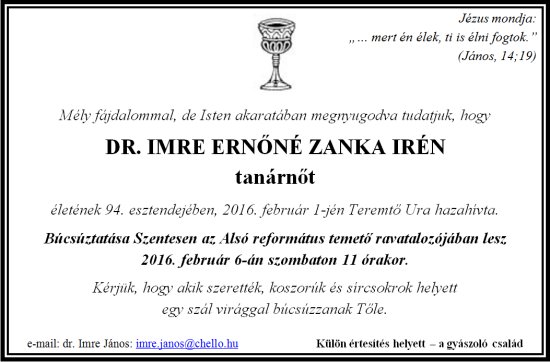 A gyászoló család mély fájdalommal, de Isten akaratában megnyugodva tudatja, hogy dr. Imre Ernőné Zanka Irén tanárnőt életének 94. esztendejében, 2016. február 1-jén Teremtő Ura hazahívta. Búcsúztatása Szentesen az Alsó református temető ravatalozójában lesz 2016. február 6-án szombaton 11 órakor.