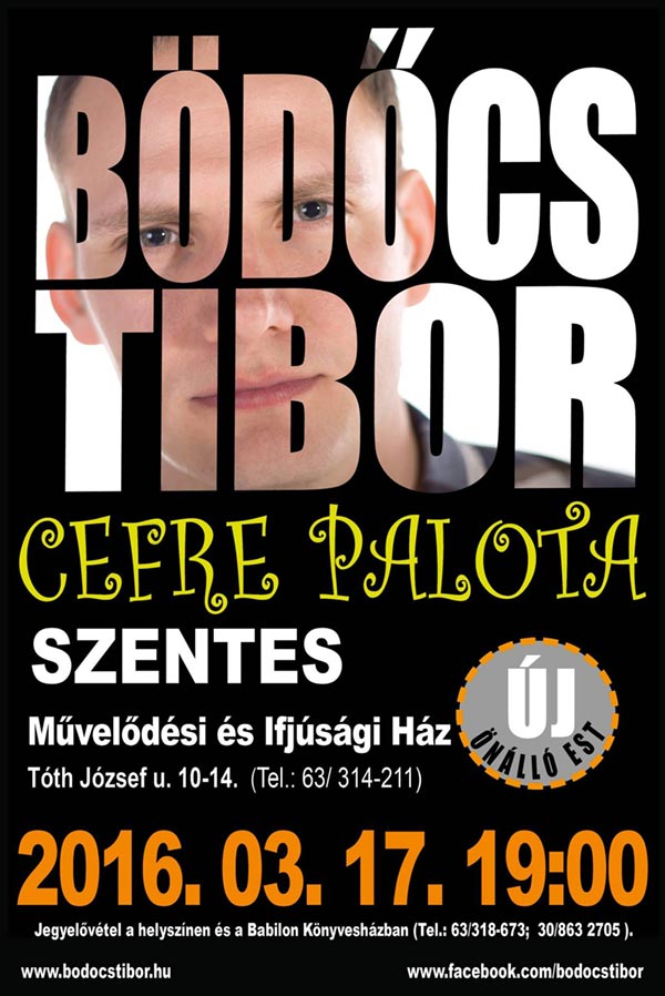 Bödőcs Tibor legújabb önálló estjével a már megszokott intellektualitással aládúcolt, legvadabb tréfák mellett egy kis teleshop-al (mert ezt nem hagyhatja ki!!) várja Önöket 2016. március 17-én az Ifjúsági Házba.
