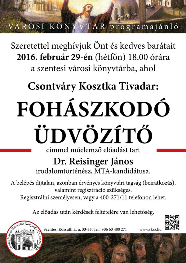 Dr. Reisinger János irodalomtörténész előadása február 29-én hétfőn 18 órai kezdettel a Szentes Városi Könyvtárban.
