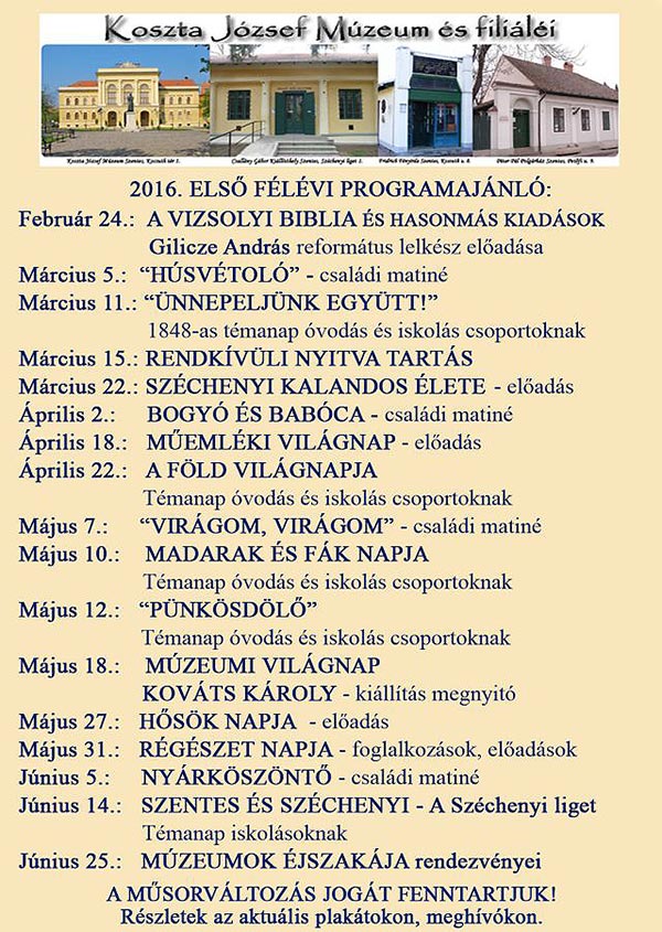 Az alábbi plakáton tekinthetjük meg a Koszta József Múzeum első félévi programtervezetét, így már jó előre lehet tervezni programjainkat.
