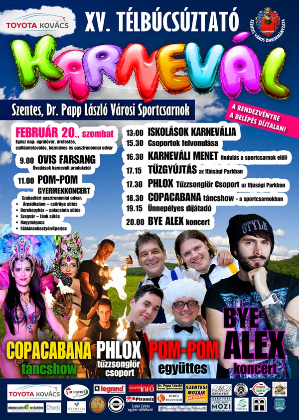 Immáron 15 éve rendezi meg Szentes a Télbúcsúztató Karnevált, ahol együtt temeti el a telet a város apraja és nagyja. Idei évben a fiatalok körében ment a találgatás, hogy melyik sztár érkezik városunkba, melyről most lerántjuk a leplet. Nagyon sokan akarták a Punnany Massif csapatot, de sajnos március végéig le lettek kötve, így már csak két fellépő (Király Viktor és ByeAlex) maradt a kalapban.