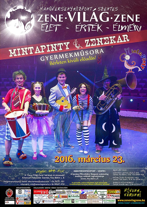 2016. március 23-án szerdán délelőtt MintaPinty zenekar gyermekműsora lesz a Hangversenyközpontban. A Zene-Világ-Zene bérleten kívüli előadására a belépő 400 Ft. Minden érdeklődőt szeretettel várnak!