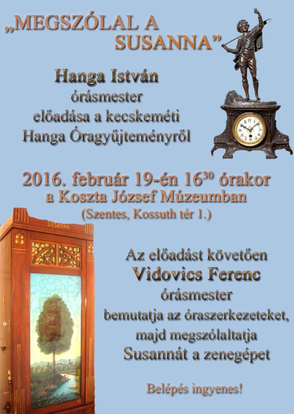 Minden Érdeklődőt szeretettel várunk 2016. február 19-én 16.30 órára Zsuzsanna napi rendezvényünkre, melyen Hanga István órásmester mutatja be a kecskeméti Hanga Óragyűjteményt, majd Vidovics Ferenc órásmester beszél az óraszerkezetekről, végül megszólaltatja Susannát a zenegépet.