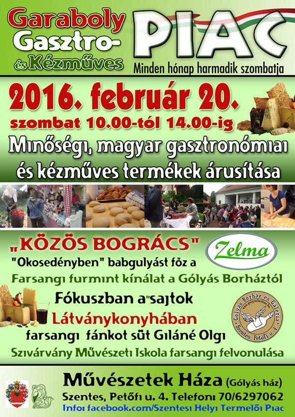 2016. február 20-án újra kinyitja kapuját a Garaboly Gasztro- és Kézműves Piac a Művészetek Házában. Ezen a napon fókuszban lesznek a sajtok, de bárki megkóstolhatja a Zelma okosedényben főtt babgulyást is. Természetesen a farsangi időszakban jól esik mindenkinek a farsangi fánk, melyet Giláné Olgi vezetésével készül. A délelőtt folytán a Szivárvány Művészeti Iskola növendékei farsangi felvonulását is megtekinthetjük. Jó vásározást kívánunk mindenkinek!