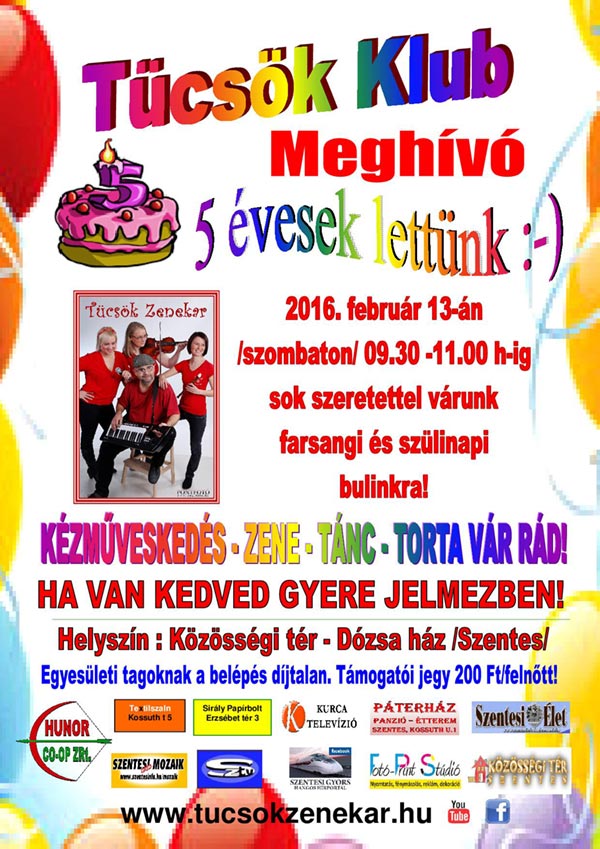 Sok szeretettel várnak mindenkit 2016. február 13-i Tücsök Klub Szülinap és Farsangi rendezvényre. Kézműveskedés - Zene - Tánc - Torta vár rátok! Az emeleten kis Játszóházat alakítanak ki a gyerekeknek. Ünnepelj az együttessel együtt!