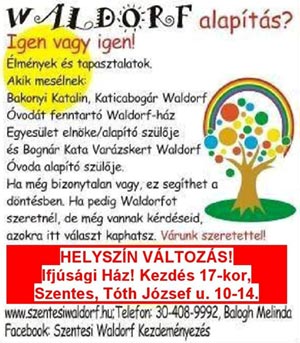 A mára (febr. 4.) meghirdetett Waldorf Pedagógia iránt érdeklődők rendezett találkozót új helyen rendezik meg, mert olyan sokan jelezték, hogy szeretnének eljönni, hogy az Ifjúsági Házba kerül megrendezésre. Kezdés 17-kor, hogy bevárjunk mindenkit! Pontos cím: Szentes, Tóth József u. 10-14.
