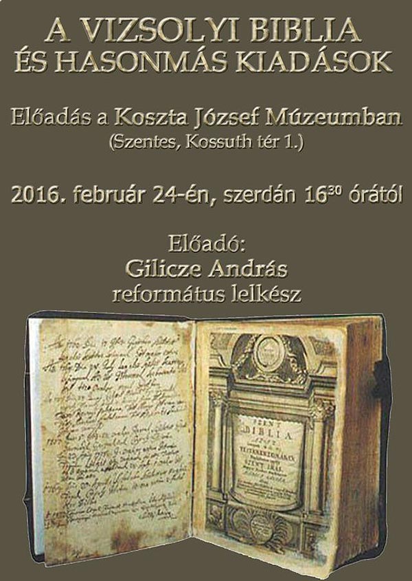 A Vizsolyi Biblia és hasonmás kiadások címmel tart előadást a Koszta József Múzeumban 2016. február 24-én 16 óra 30 perckor Gilicze András református lelkész. Minden érdeklődőt szeretettel várnak az érdekes előadásra!