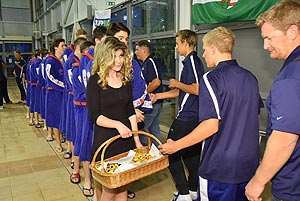 A köszöntés első mozzanataként a két nemzet csapatai zászlójukkal vonultak be a köszöntés színhelyére. Ezután Kiss Viktória elénekelte a két nemzet himnuszát, melyet mindenki áhítattal hallgatta/énekelte, majd Szentes város nevében Szirbik Imre polgármester köszöntötte a vendégeket, majd egy kis barátság süteménnyel kínálták meg a csapatokat.