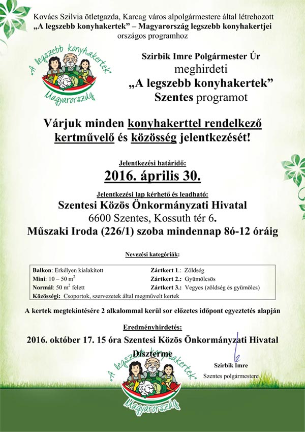 Kovács Szilvia ötletgazda, Karcag város alpolgármestere által létrehozott „A legszebb konyhakertek” – Magyarország legszebb konyhakertjei országos programhoz Szirbik Imre polgármester meghirdeti „A legszebb konyhakertek” Szentes programot