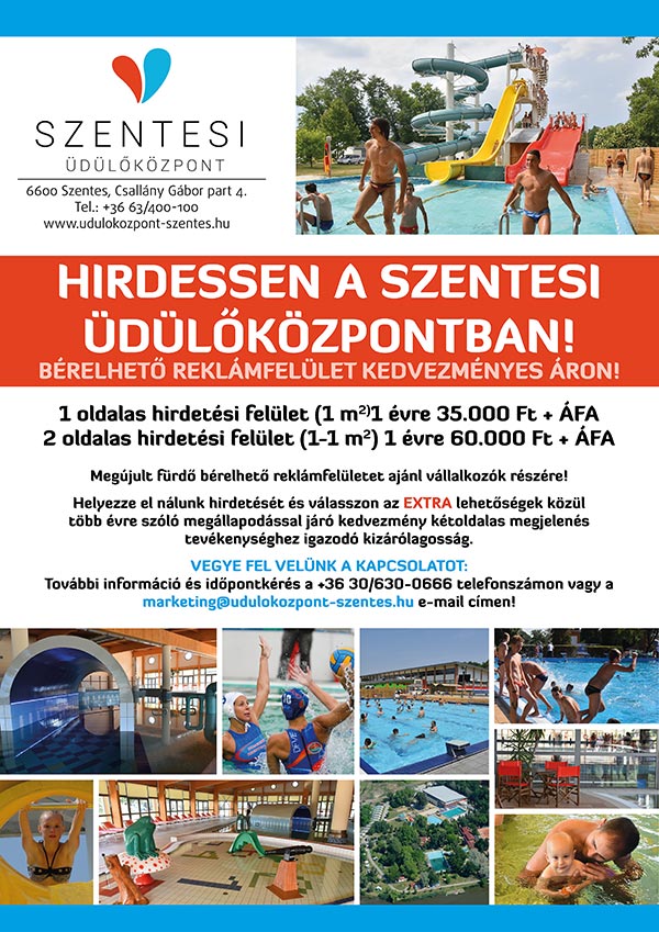 Érdemes átgondolni a következő ajánlatot, melyben bérelhető reklámfelületet vásárolhatunk kedvezményes áron a Szentesi Üdülőközpontban! A megújult fürdő bérelhető reklámfelületet ajánl vállalkozók részére! EXTRA lehetőségek: - több évre szóló megállapodással járó kedvezmény - kétoldalas megjelenés - tevékenységhez igazodó kizárólagosság