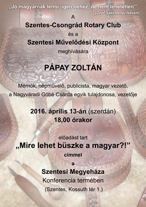 Szentes-Csongrád Rotary Club és a Szentesi Művelődési Központ meghívására PÁPAY ZOLTÁN Mérnök, népművelő, publicista, magyar vezető a Nagyváradi Góbé Csárda egyik tulajdonosa, vezetője 2016. április 13-án (szerdán) 18.00 órakor előadást tart „Mire lehet büszke a magyar?" címmel a Szentesi Megyeháza Konferencia termében (Szentes, Kossuth tér)