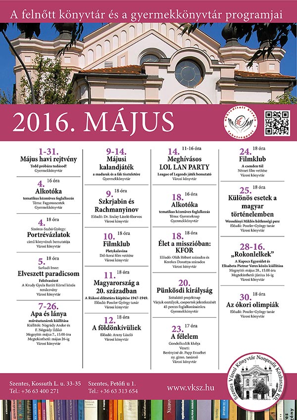 Összeállt a Városi Könyvtár május havi programja, melyet az alábbi plakát foglal össze! Jó böngészést és kellemes kikapcsolódást kívánunk hozzá!