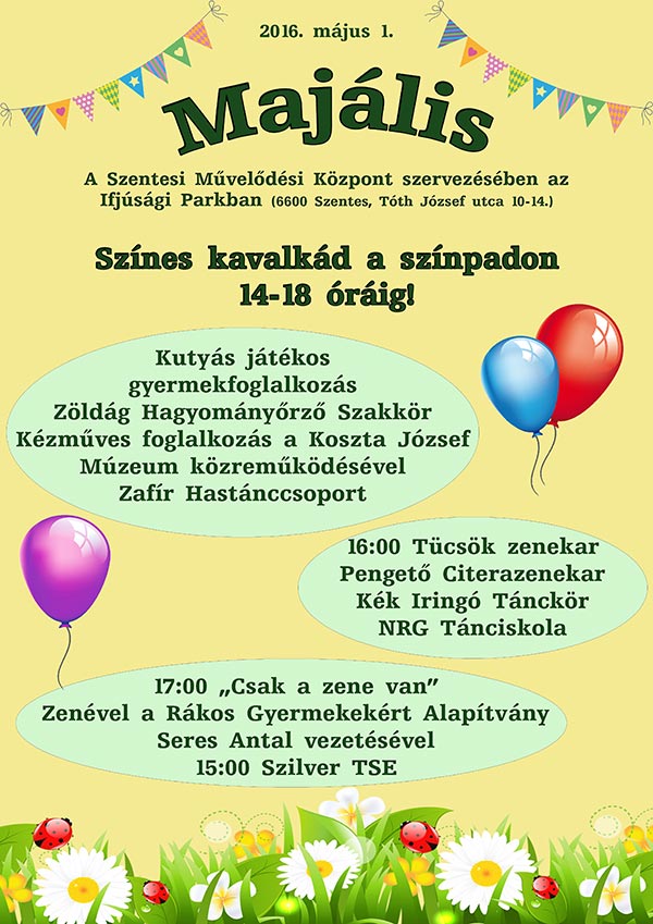 Április 30-án igaz középiskolai ballagások lesznek városunkban, de az esti bulira sokan készülnek. Ezen a napon a Luther téren indul a program a megszokott térzenével. Utána viszont Sportfelvonulás lesz, melyen a város sportegyesületei mutatják be egyesületüket, sportjukat és versenyzőiket a nagyközönségnek. Így kapcsolódik az egész évre meghirdetett SZENTES 20 sport programsorozathoz ez a rendezvény. Napnyugtával indul a lampionos felvonulás, amikor is a téren lévők közösen levonulnak az Ifjúsági Ház melletti szabadtéri színpadhoz. A nap zárásaként COMPACT DISCO nagykoncert lesz a színpadon!