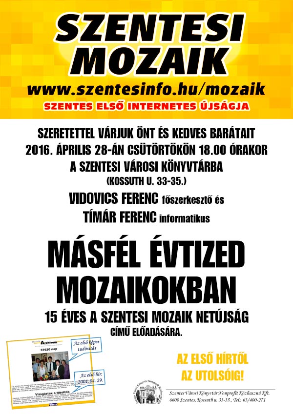 Másfél évtized mozaikokban - címmel születésnapi visszaemlékező beszélgetés részesei lehetnek azok, akik részt vesznek a 2016. április 28-ai beszélgetésen a Városi Könyvtárban. Ezen a napon Tímár Ferenc és Vidovics Ferenc eleveníti fel a Szentesi Mozaik igen mozgalmas másfél évtizedét. Jöjjön el, és bepillantást nyerhet az újság kulisszatitkaiba!