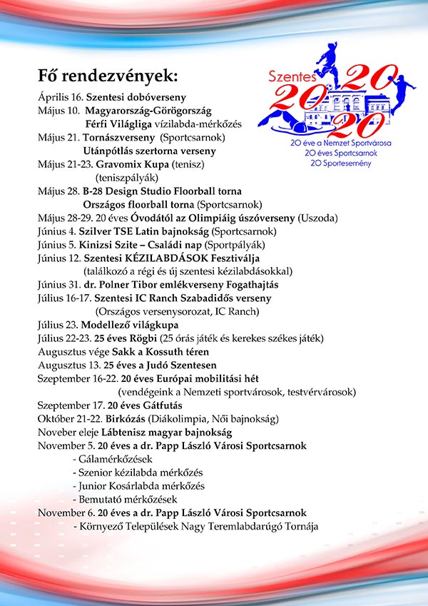 Tisztelt szentesi lakosok! 20 évvel ezelőtt vehettük át a Nemzet Sportvárosa címet, melyet azóta is büszkén viselünk. Az elmúlt évtizedekben számos sportegyesület, egyéni sportoló vitte városunk jó hírnevét világszerte. A profi és amatőr sportolók sikerei sokszor dobogtatták meg a szentesi emberek szívét, szülők álltak büszkén gyermekük sikerét látva lelátókon, pályák mellett, de akkor is, amikor először ültek kerékpárra vagy úsztak kicsi korukban önállóan. Egyedülálló lehetősége városunknak, hogy számtalan lehetőség van a sportolásra, az egészséges életmódra nevelésre, és mindannyiunk közös örömére, a sikerekre.