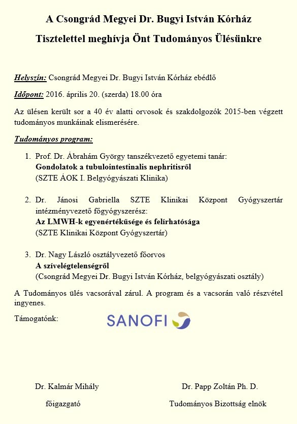 A Csongrád Megyei Dr. Bugyi István Kórház Tisztelettel meghívja Önt Tudományos Ülésére. Helyszín: Csongrád Megyei Dr. Bugyi István Kórház ebédlő Időpont: 2016. április 20. (szerda) 18.00 óra