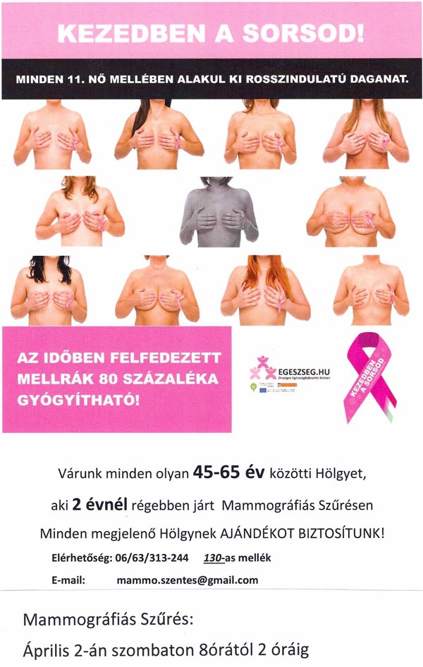 Következő szűrési lehetőség: 2016. április 2-án szombaton a Szentesi Mammográfiás Szűrőközpont MAMMOGRÁFIÁS SZŰRŐNAPOT tart. 8:00- 14:00- ig.