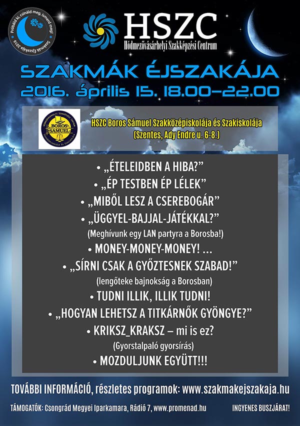 Sokféle éjszaka van, múzeumok, kutatók éjszakája, miben különbözik ettől a Szakmák Éjszakája? Sokban: mert nem csak színes és szórakoztató programokat, hanem ennél sokkal többet: a jövőjüket, lehetséges életutakat kínál ez az est. Most egy éjszaka alatt végigjárhatod a szentesi szakképző iskolákat, a velük együttműködő sikercégek máskor rejtett világát, feltárhatod a menő szakemberek titkait, megnézheted, melyik foglalkozás mit takar, játssz végig akár ezer pályát néhány óra alatt! Lehet, hogy a jövőd itt, ezen az éjszakán kezdődik!