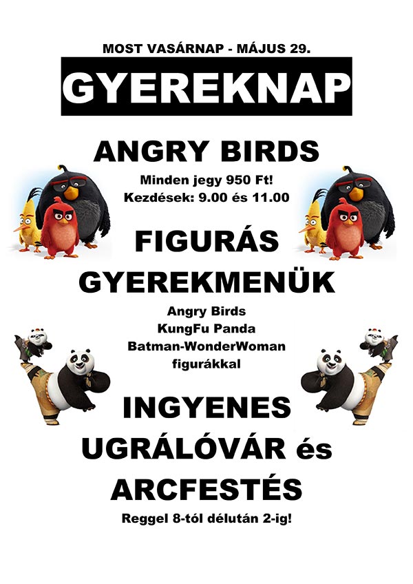 2016. május 29-én vasárnap egész nap minden mozijegy 950,- Ft-os egységáron vásárolhatók meg. Ingyenes ugrálóvár, mérges madarak és Po vár benneteket a Szentesi Moziban!
