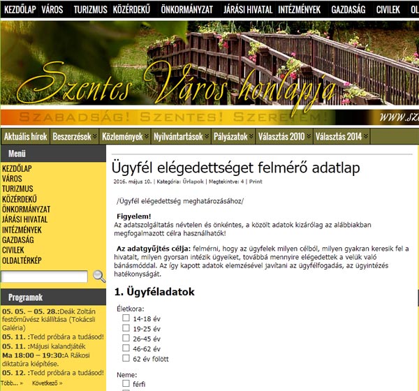 Szentes Város Önkormányzata Képviselő-testülete 2016. évi munkaterve szerint a szeptember havi rendes ülésén napirendre tűzi A közigazgatási elégedettségről szóló jelentés megtárgyalását. Ennek elkészítéséhez fontos, hogy megismerjük az Önök véleményét a hivatalban folyó munkáról.