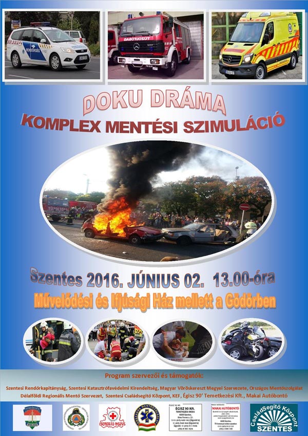 A programon a Rendőrség, Katasztrófavédelem és a Mentőszolgálat, Vöröskereszt munkatársai együttműködve, egy szimulált baleseti helyszínt állítanak fel. A szimuláció, a közlekedési baleset bekövetkezésétől indulva életszerűen mutatja be a mentés folyamatát a sérültek ellátásán keresztül a járművekből való mentésen át egészen a rendőri intézkedés befejezéséig. A komplex mentési bemutató célja a figyelem felhívás a veszélyhelyzetek, balesetek elkerülésére, a felelős- tudatos magatartás fontosságára. További cél az áldozattá- sértetté válás megelőzése, a veszélyhelyzetek elkerülése, mely szintén fontos tudáselem, valamint a tanulóknak szükséges ismeretekkel rendelkezni arról, hogy mit kell tenni és mit nem szabad csinálni baleset, tűzeset bekövetkezése során. A 2016. június 02-án 13.00-órától tartandó komplex mentési bemutató megtekintését felső tagozatos tanulóknak ajánlott. Helyszín: Szentesi Művelődési Ház (Szentes, Tóth József utca 10.) melletti területen a Gödörben.