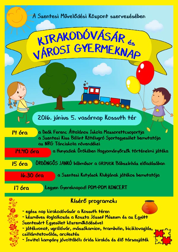 A Kossuth téren június első vasárnapján hagyományosan kirakodóvásár várja a közönséget, párosulva a városi gyermeknappal. A Művelődési Központ népszerű rendezvénye három évtizedes múltra tekint vissza, amit mindig nagyon vár kereskedő és vevő, felnőtt és gyerek egyaránt.