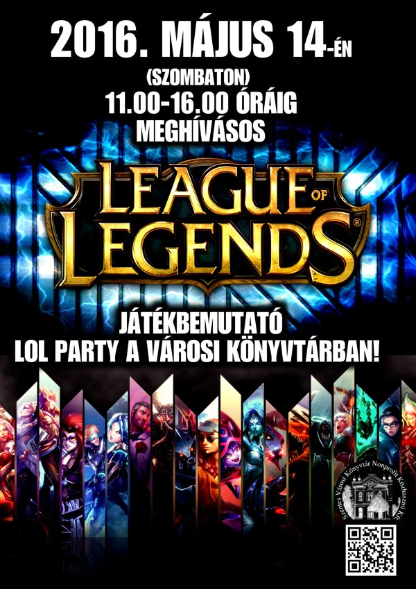 2016. május 14-én(szombaton) 11.00-16.00 óráig meghívásos League of Legends játékbemutató (LOL Party) a Városi Könyvtárban! Nézd meg a profik hogyan játszanak! Kivetítés és kommentár játék közben!!! A belépés INGYENES!
