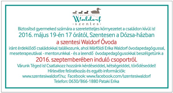 2016.május 19-én 17 órától Szentesen a Dózsa-házban a szentesi waldorf óvoda iránt érdeklődő családokkal és Márföldi Erika Waldorf óvodapedagógussal meseterapeutával és a leendő óvodapedagógusokkal találkozhatnak az érdeklődők és tájékozódhatnak a 2016. szeptemberében induló csoportról.