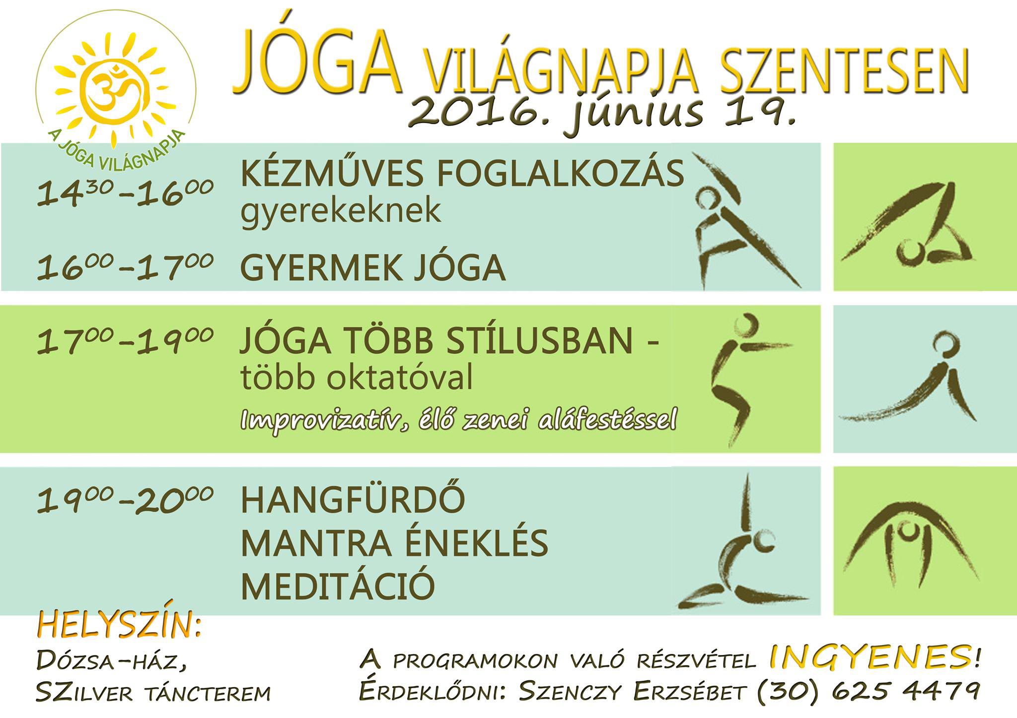 Ez alkalomból Szentesen a Dózsa-ház (Szilver táncterme) ad otthont a Jóga világnapi programoknak 2016. június 19-én, melyen a részvétel INGYENES!
